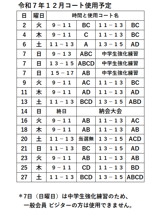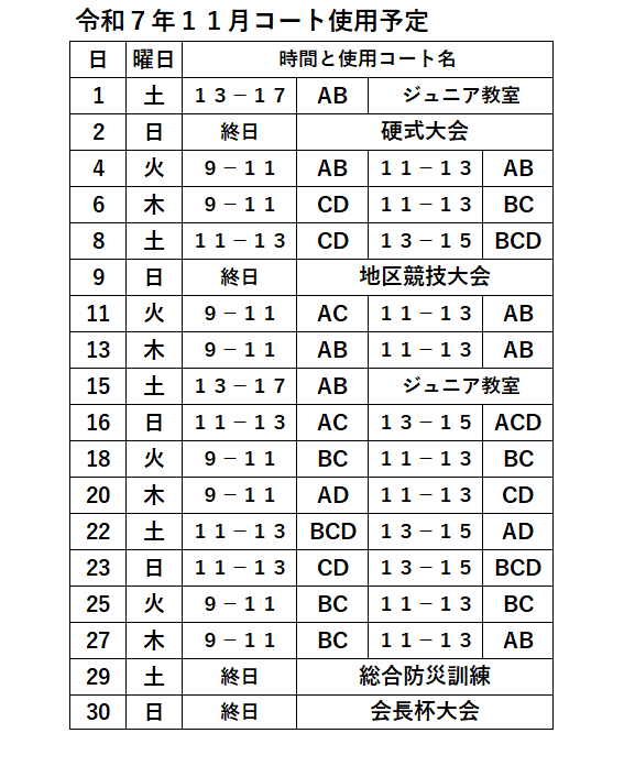 | 活動日 | 火曜日、木曜日(9時~13時) 土曜日、日曜日、祝日(4月から8月:12時~16時、9月~3月:11時~15時) コートの抽選の状況により活動日が変更になる場合があります コート利用のお知らせをご確認ください |